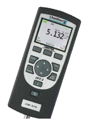 Chatillon DFE II係列開創了數顯測力計的新時代。這款小巧、易用的測力 計經濟實用、功能強大,是手持式或測試台應用的好的選擇。DFE II 係列 測量範圍在 2 lbf (10 N) 到 500 lbf (2500 N) 之間。DFE II 具有一個 內置負載傳感器,其測量精度達到滿量程的 0.25% 以內。一個易讀的高分 辨率點陣 LCD 全彩大顯示屏,支持多種標準測量功能,包括標準和峰值讀 數、高/低限值、設定值、合格/不合格結果、統計結果、測力元件驅動和 方向。負載顯示單位為 ozf(盎司力)、gf(克力)、lbf(磅力)、kgf (千克力)和 N(牛頓)。顯示屏可反向顯示,操作員甚至可“隱藏”顯 示的結果。
